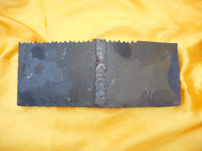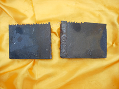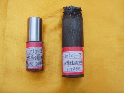 使用与未使用铁神一号净化剂的对比 经铁神一号净化剂处理后的灰铸铁,焊接性能得到了极大的提高,可以使用422焊接和焊补,并且可以加工。下面是在常温下,使用422焊条焊接后的试样。